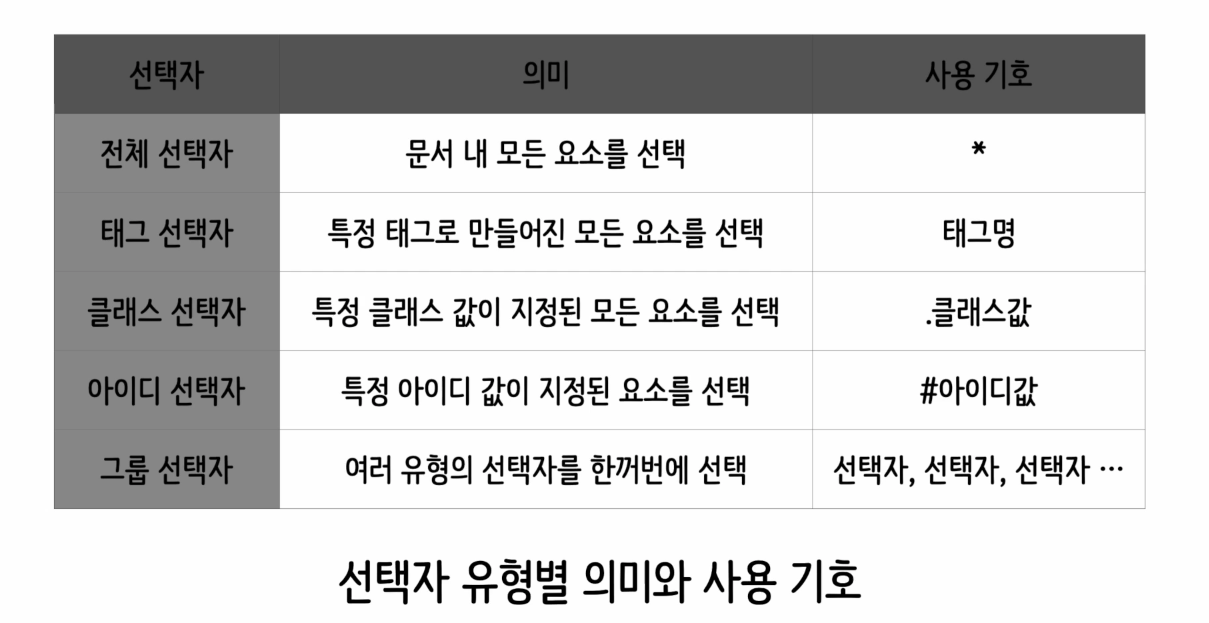 CSS는 다음과 같이 여러가지 유형의 선택자를 지원한다.