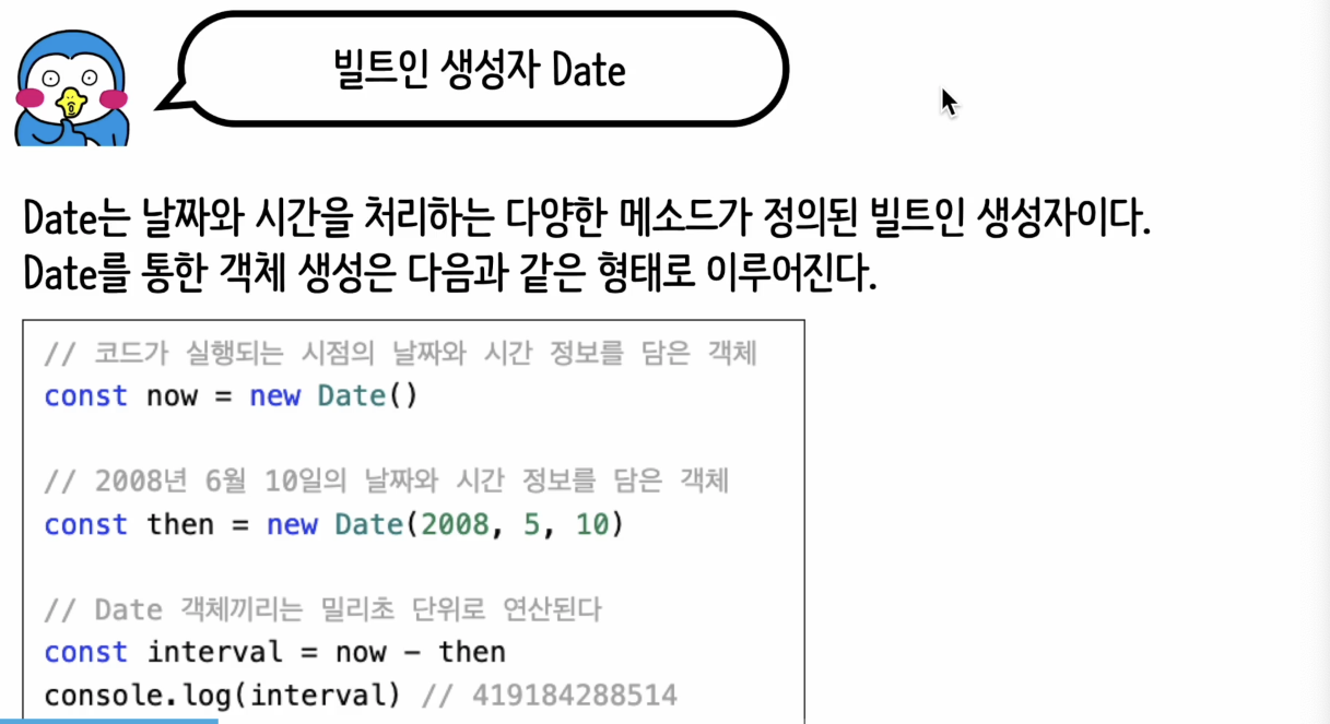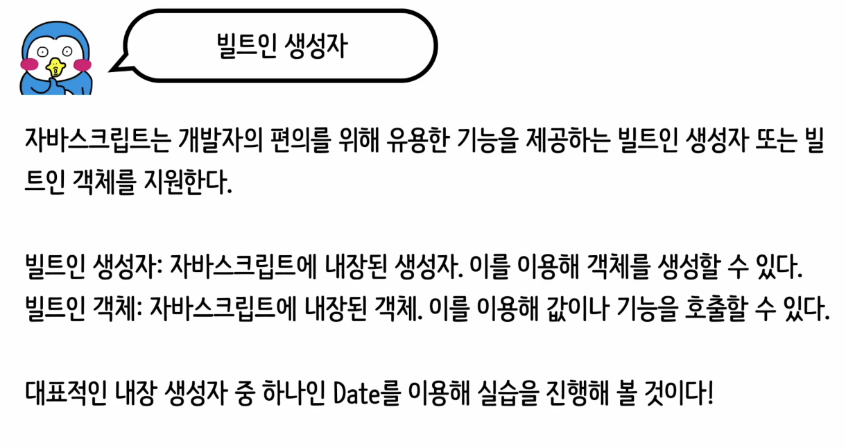 Date는 자바스크립트에서 내장된 객체이며 , 메소드 또는 함수가 아니라 객체생성자(Constructor)다.