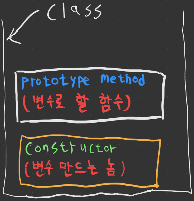 class "함수이름"{constructor(매개변수){this.변수 = 변수값}함수(){}}