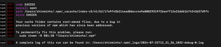 이 명령어는 sudo chown을 이용하여 , '.npm'디렉토리와 그 하위 파일들의 소유자를 현재 사용자로 변경하는 명령어다.