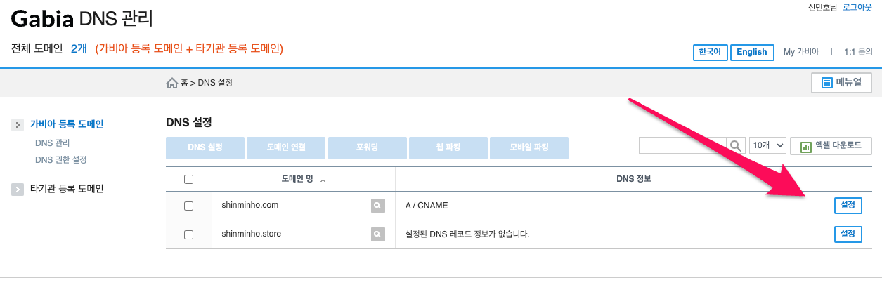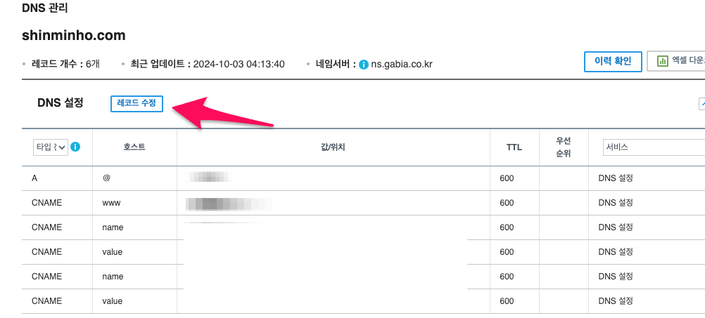 아래 CNAME 이름, CName값이 중요하다. 이 값들을 가비아에 들고 갈거다.