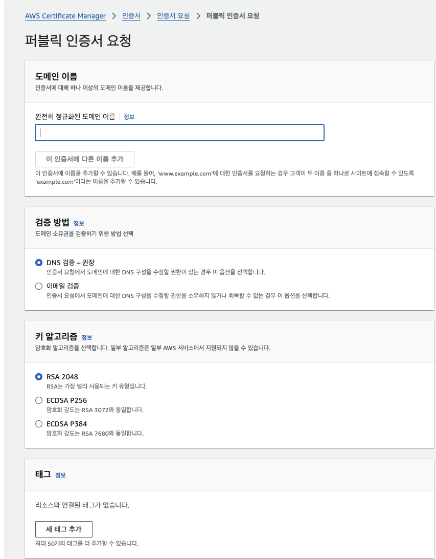 3.AWS Certificate Manager에 들어가서 인증서 > 인증서 요청