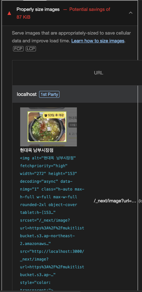 "Properly size images" : 브라우저가 필요로 하는 크기보다 더 큰 이미지를 로드해서 성능이 떨어질 때 발생