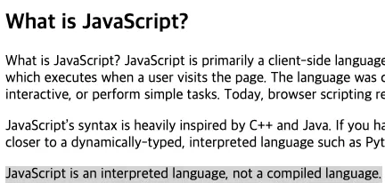 - JS 는 컴파일 처리되는 언어다. (그치만 동적 프로그래밍 언어임) JS 엔진을 비롯한 여러 도구가 JS 로 작성한 코드를 처리하고 , 코드를 실행하기 전에 코드를 점검한다. 이때 오류가 있으면 오류도 보고한다.
