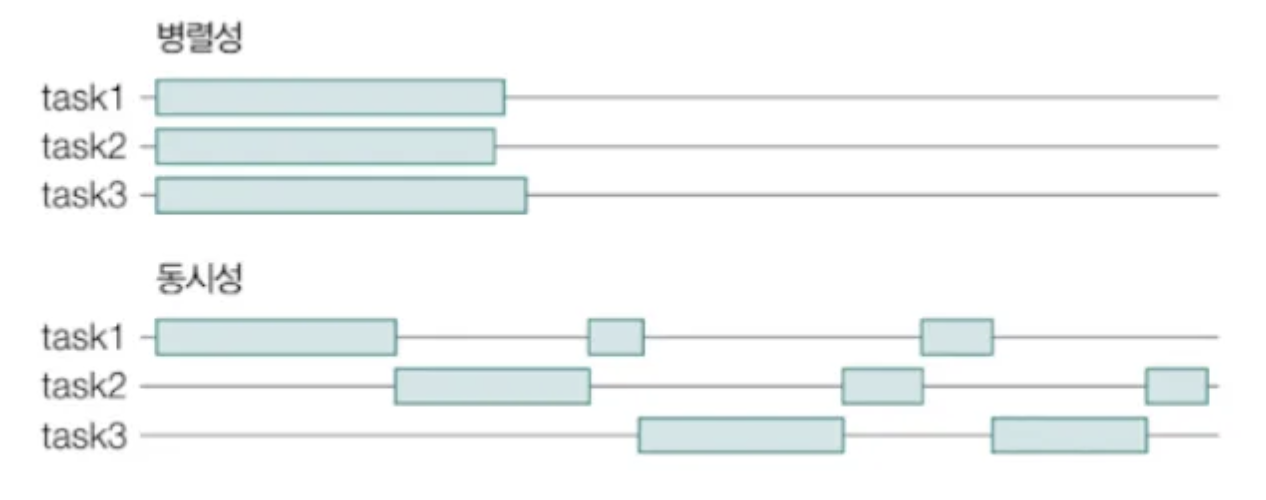 - 병렬성 : 작업을 물리적으로 동시에 처리하는 성질