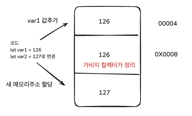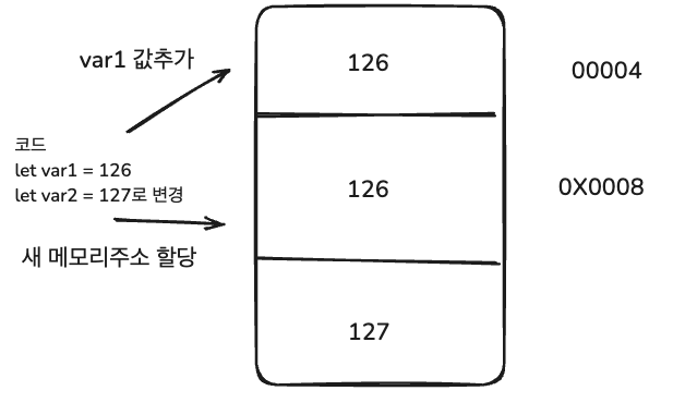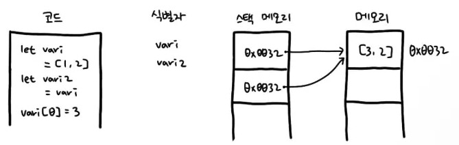 - 변수가 값을 직접 저장하는 게 아니라, **메모리 주소(참조값)**를 저장함.