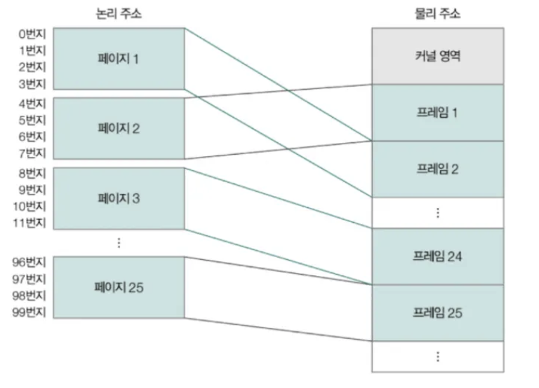 - 프로세스의 논리 주소 공간을 **페이지(page)**라는 단위로 나눔