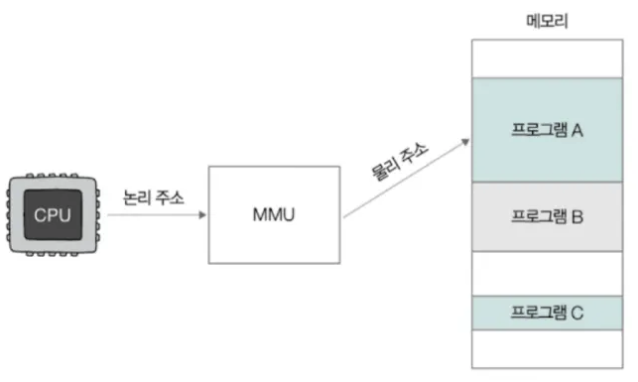 - 논리 주소(logical address) : CPU가 생성한 주소로, 가상 메모리에서의 위치를 나타내며 물리 주소로 변환(MMU)되어 실제 메모리에 매핑됨.